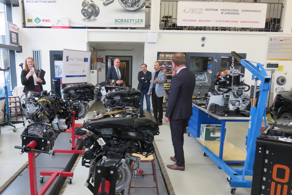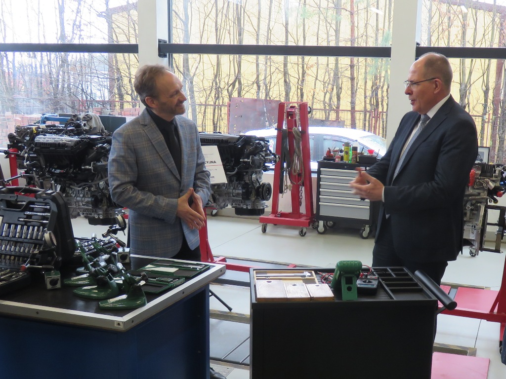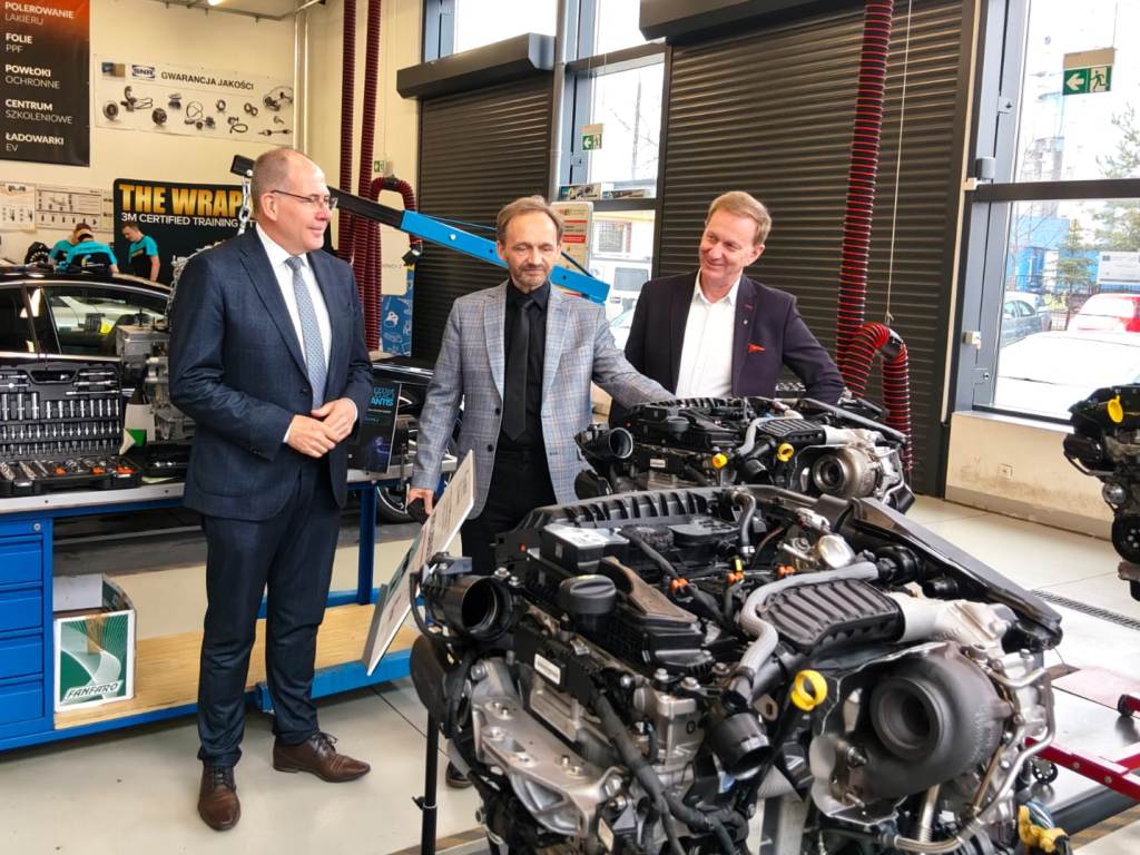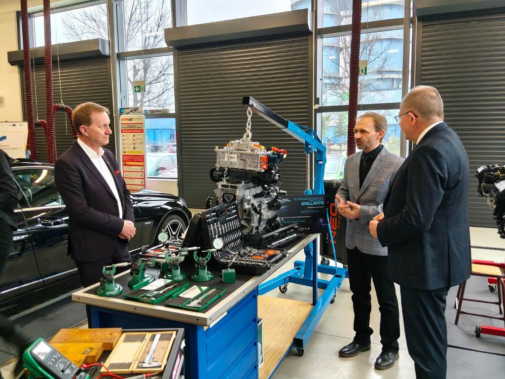 Pan Jacek Brzezinka – Zastępca Prezesa KSSE S.A. oraz pan Sławomir Duch – Dyrektor Działu Rozwoju Rynku Pracy w KSSE S.A. oficjalnie przekazali naszej placówce nowoczesne silniki produkowane przez koncern STELLANTIS. Są to silniki spalinowe najnowszej generacji GEN3 EB2LTx wraz z całym osprzętem oraz kompletny elektryczny zespół napędowy stosowany w samochodach osobowych i dostawczych. Otrzymane silniki stanowić będą cenną pomoc dydaktyczną dla uczniów kształconych w zawodach: mechanik pojazdów samochodowych oraz technik pojazdów samochodowych. Uczniowie CKZ po nabyciu umiejętności montażu i obsługi serwisowej tych silników wejdą na rynek pracy z zasobem aktualnych, dodatkowych kwalifikacji, które są cenne i bardzo pożądane dla przyszłych pracodawców.