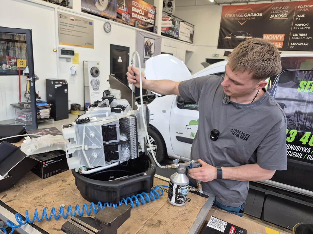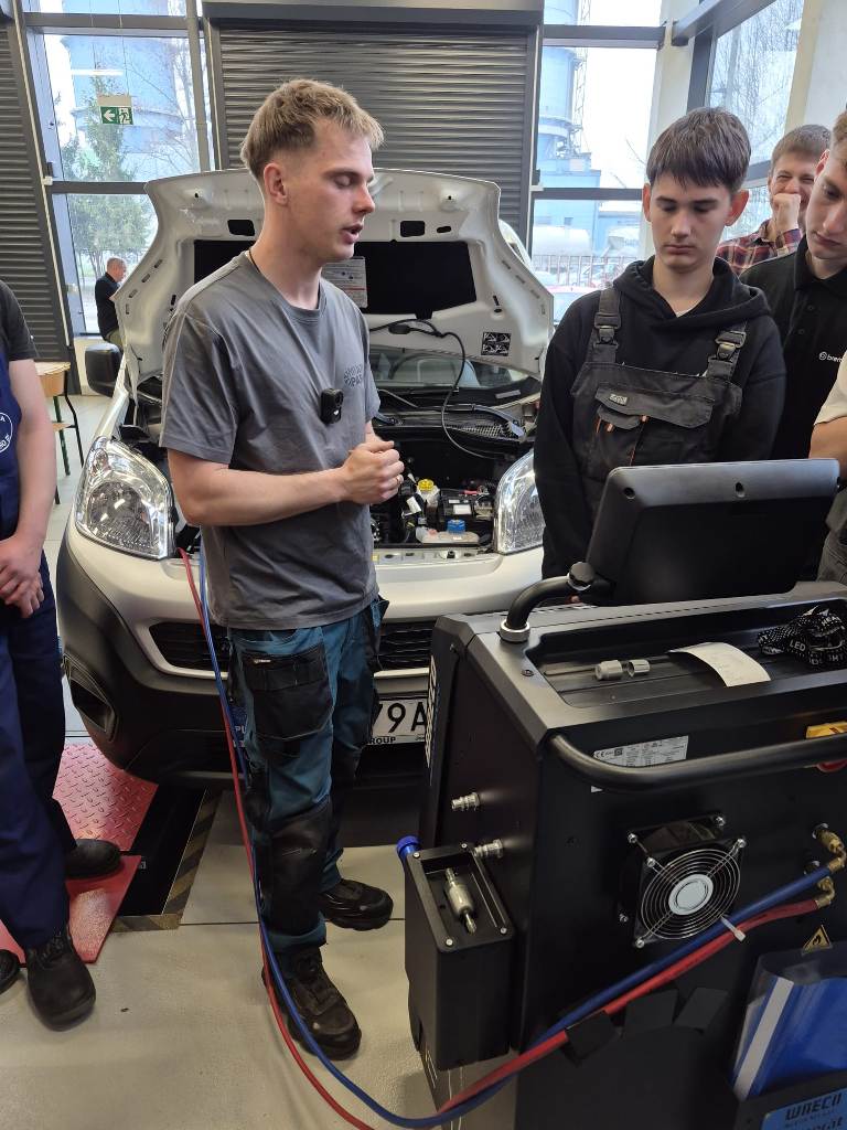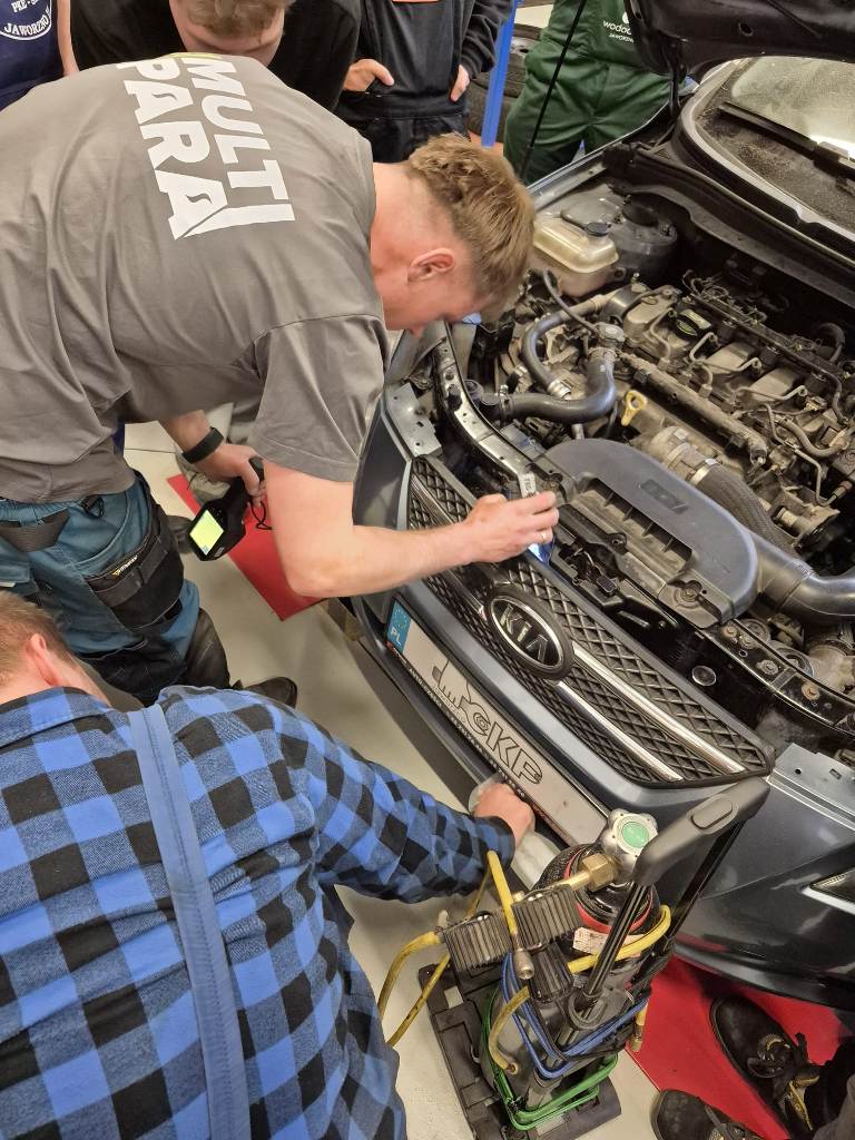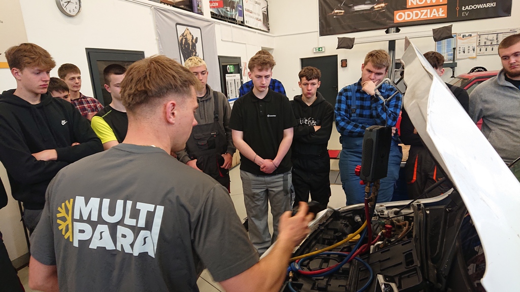 Kluczowym elementem szkolenia była jednak część praktyczna. Pod okiem specjalistów z firmy MULTIPARA uczniowie uczestniczyli w instruktażu serwisowym, a następnie samodzielnie wykonywali zadania związane z obsługą i diagnostyką układów klimatyzacji. Młodzież miała okazję pracować używając profesjonalnego sprzętu warsztatowego oraz poznając realne procedury stosowane w branży.